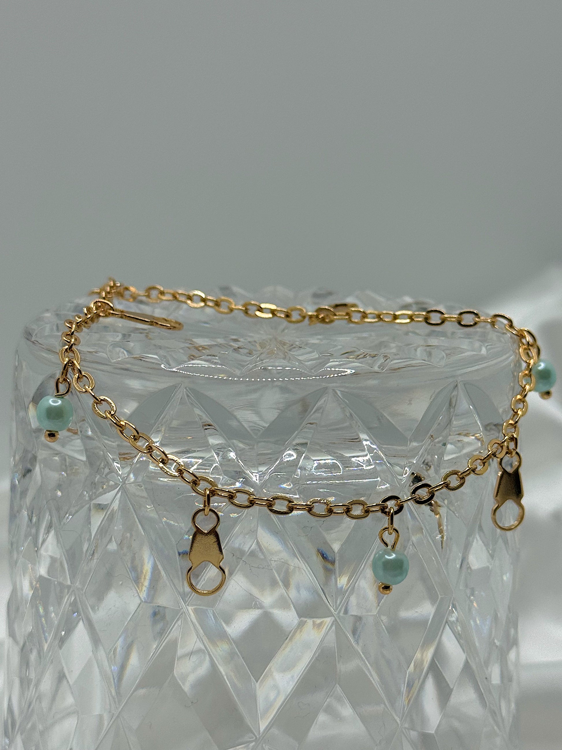 Delicate and timeless, the Aqua Charm Anklet features a fine gold-plated chain adorned with soft aqua beads and modern geometric pendants. Its subtle shimmer and playful movement make it the perfect accessory to elevate both casual looks and evening wear. Designed to bring a touch of elegance to every step