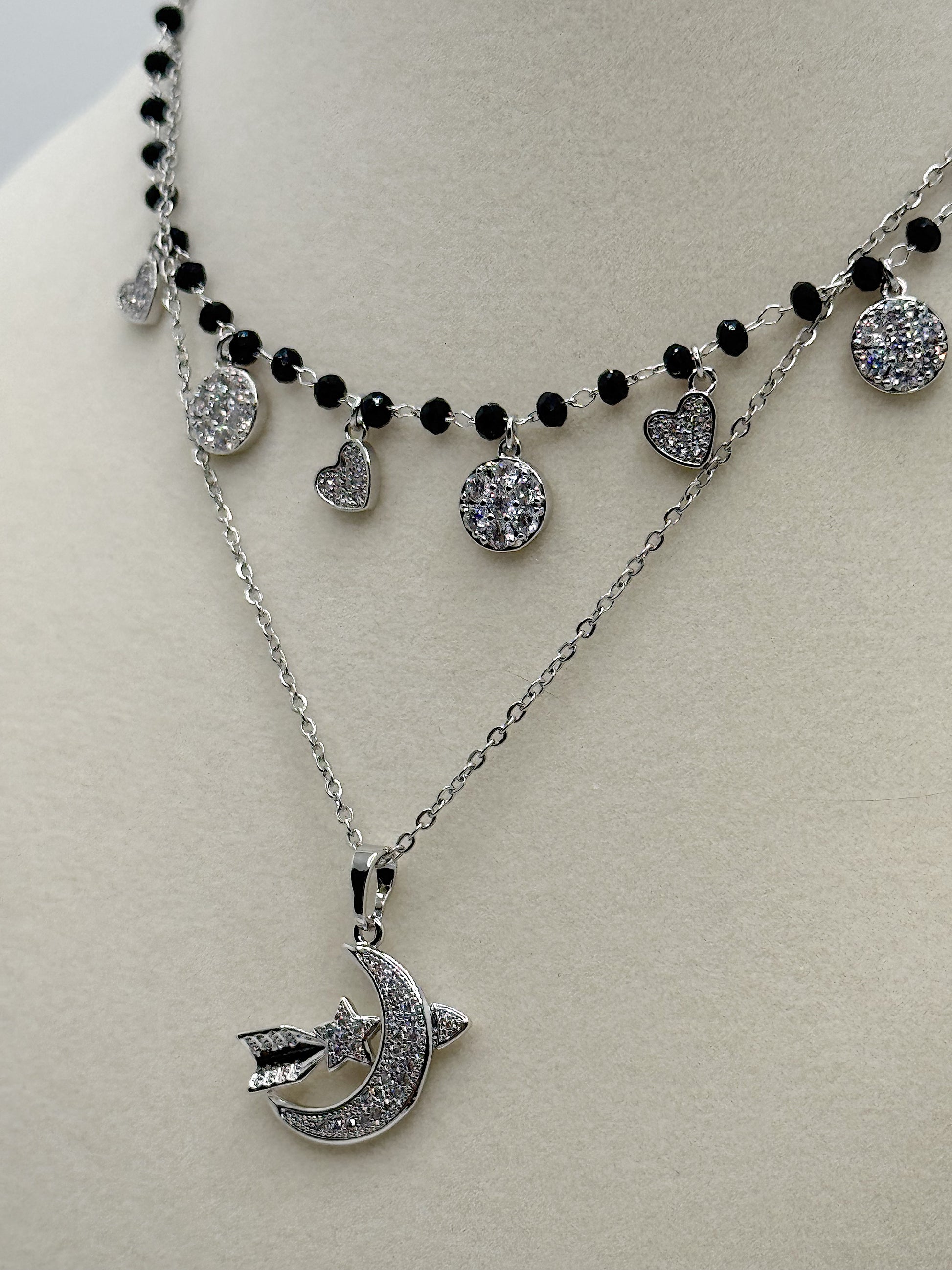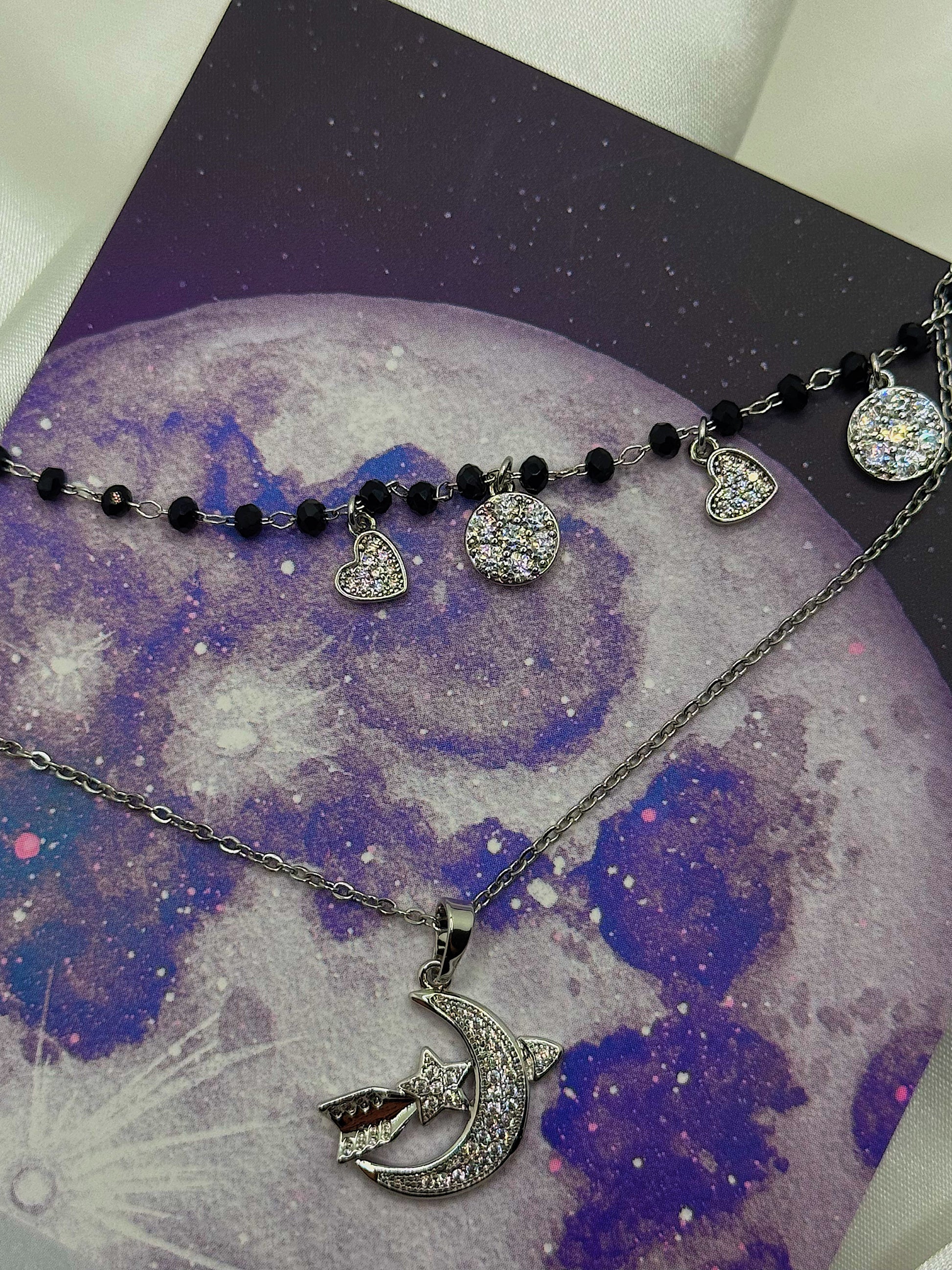 Layers of sparkle meet celestial charm — shimmering hearts, radiant discs, and a crescent moon kissed by a star. A statement piece that shines as bright as you do✨🌙
