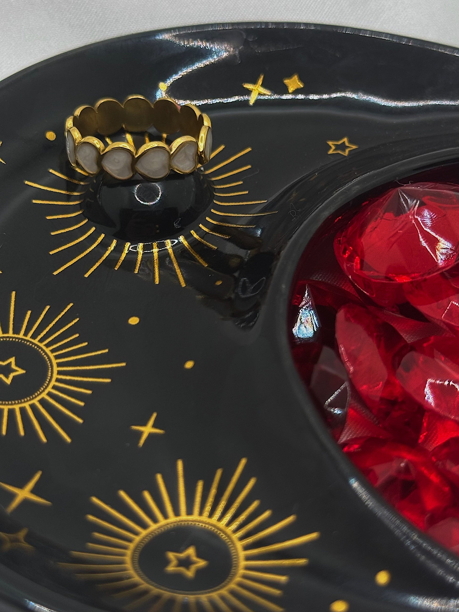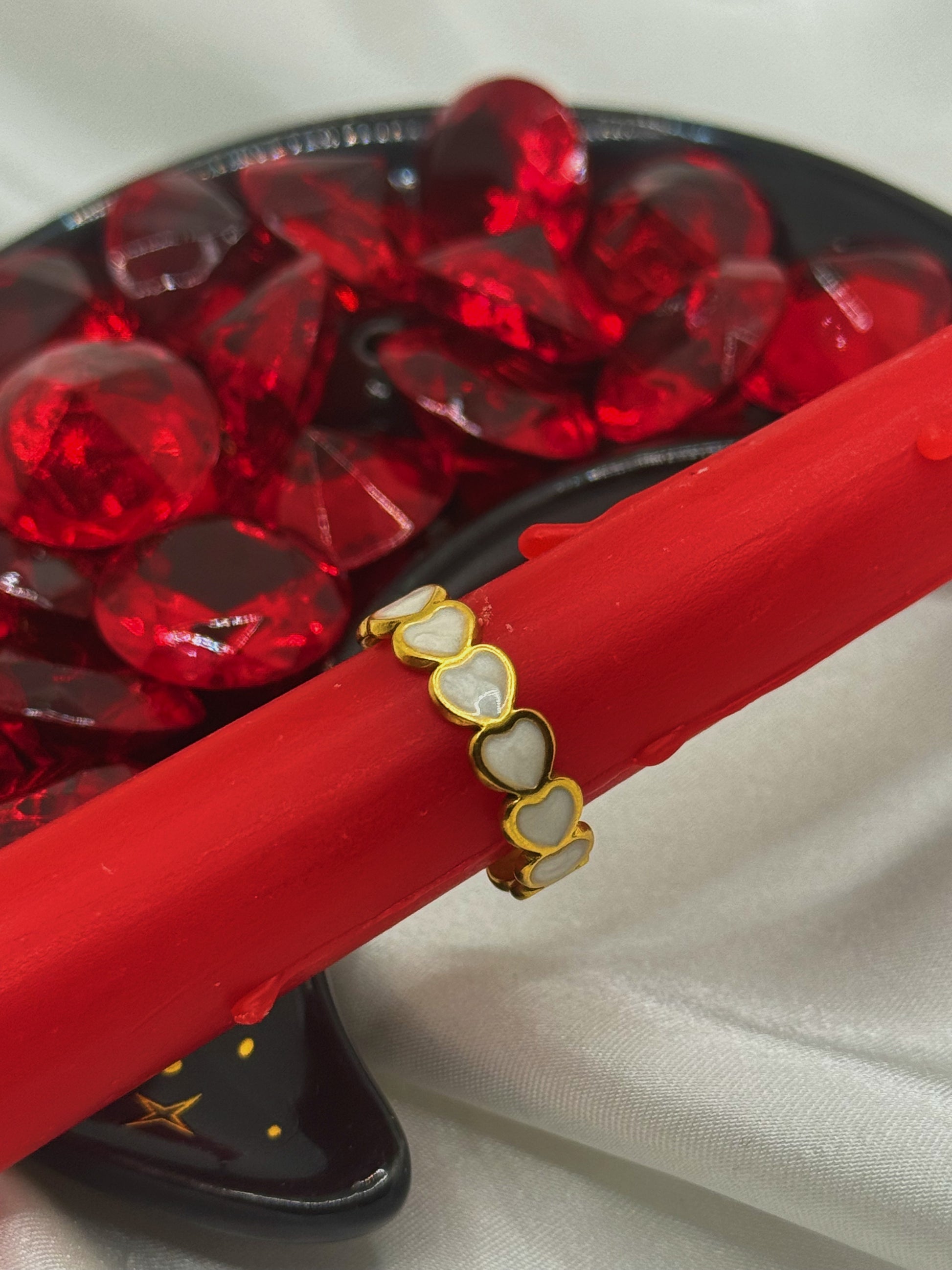 This delicate open band features a row of white enamel heart details outlined in 18K gold plating over durable stainless steel. Finished with ion plating (IP) for a waterproof, non-tarnish shine, it’s a sweet and simple piece that can be worn alone or stacked for a playful, romantic look.